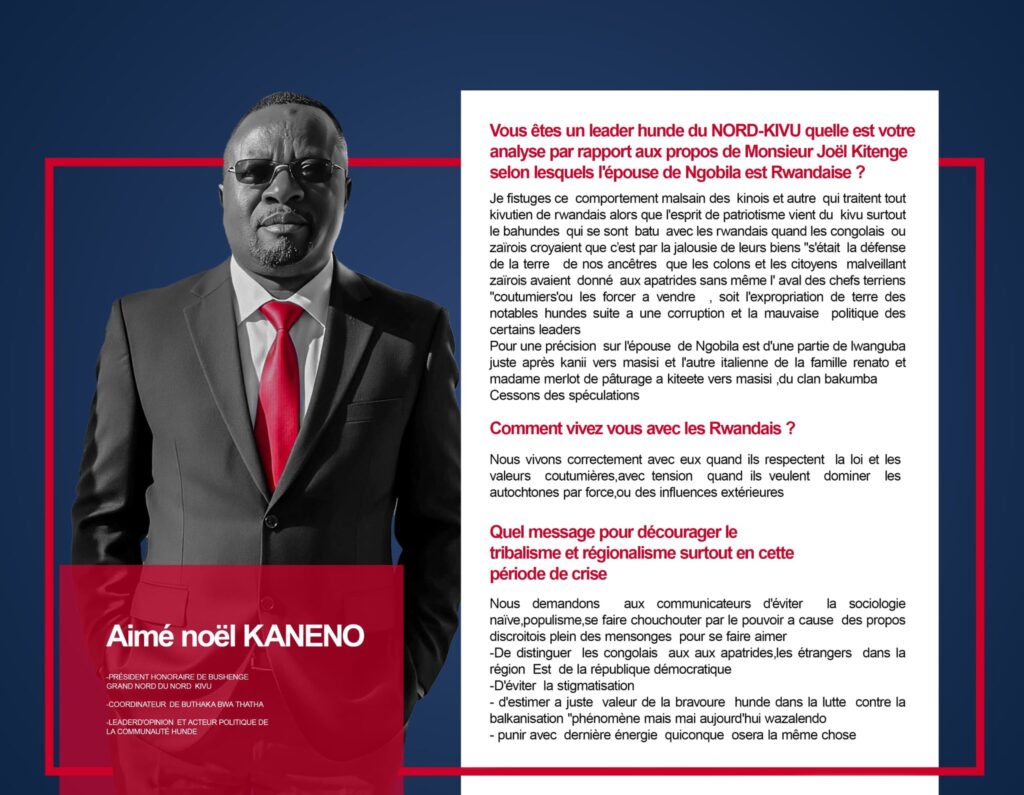 Nord-Kivu : Le leader hunde Aimé Noël Khaneno brise le silence et recadre sévèrement Joël Kitenge après ses propos mensongers visant l’épouse du Sénateur Gentiny Ngobila