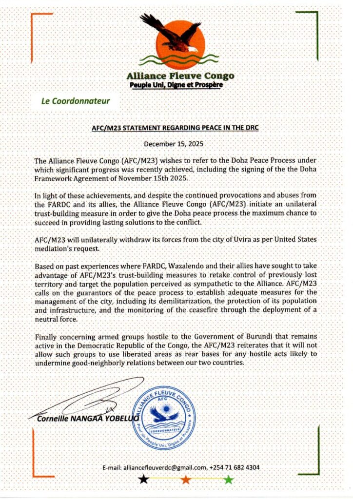 L’annonce du retrait unilatéral des forces de l’AFC/M23 de la ville d’Uvira, conformément à la demande de la médiation des États-Unis, constitue un tournant politique et sécuritaire majeur dans la crise qui endeuille l’Est de la République démocratique du Congo. Ce geste, présenté comme une mesure de confiance dans le cadre du processus de paix de Doha, ne peut être accueilli ni avec naïveté, ni avec mépris, mais avec une lucidité patriotique exigeante.